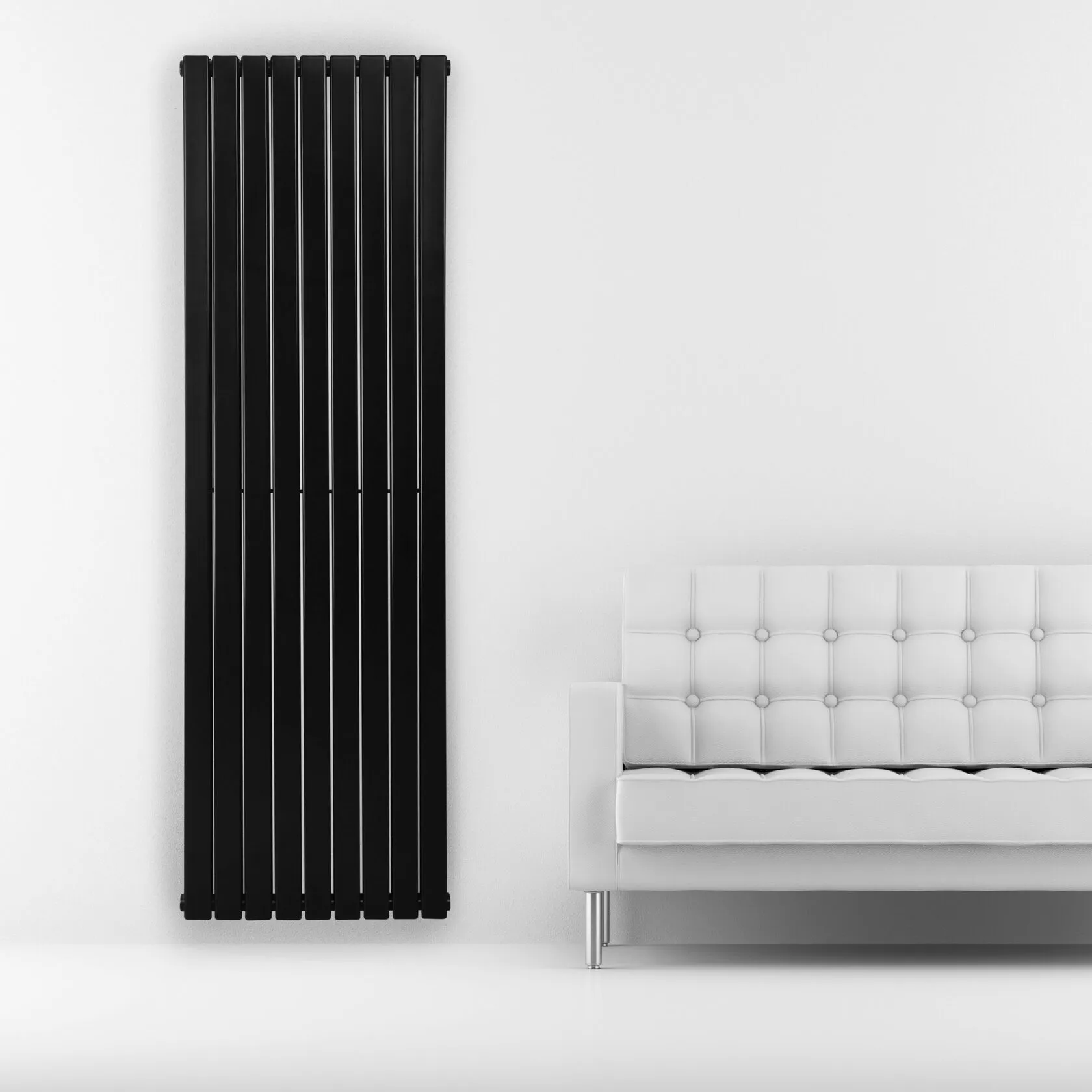 Вертикальний дизайнерський радіатор Blende у розмірі 1800×504 мм — це панельне рішення для інтер’єрів, де опалення має виглядати максимально стримано та зливатися з архітектурою стіни. Суцільна лицьова поверхня формує чисту геометрію без зайвих деталей і забезпечує рівномірний фоновий обігрів приміщення.